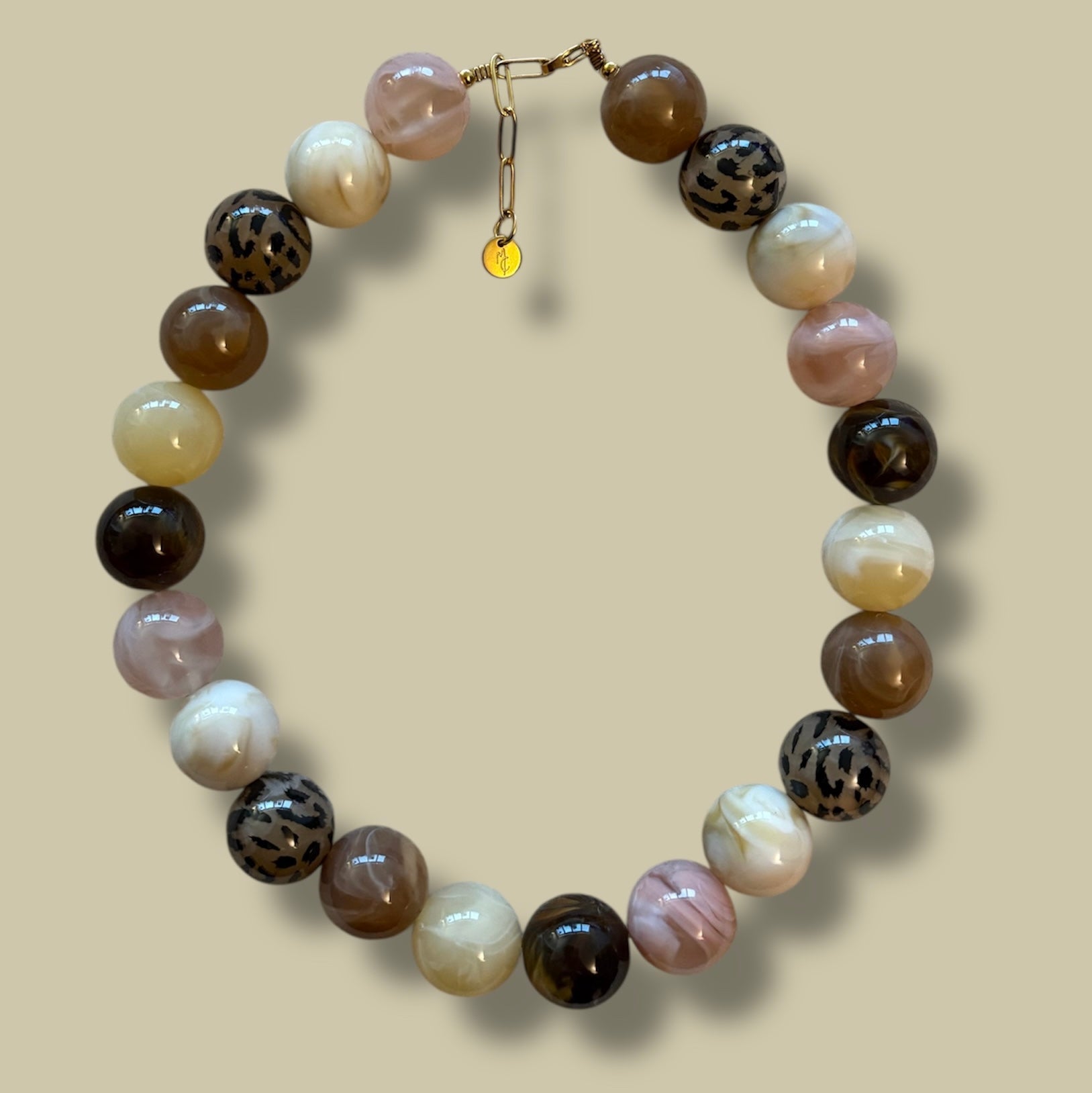 Notre collier Lina est monté sur un fil de cuivre et est composé de perles en plastique, d’une médaille logotée et de perles en acier inoxydable.